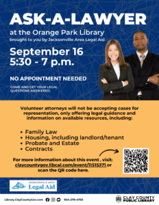Our partners at the Jacksonville Area Legal Aid office offer two upcoming opportunities to receive assistance from their staff at no cost.
